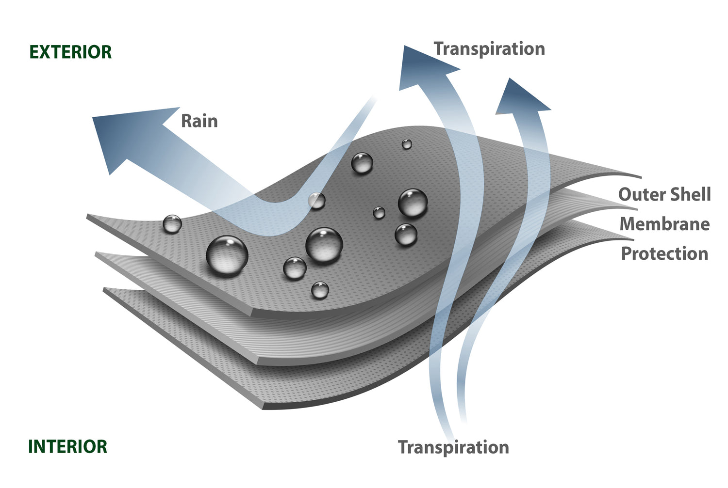Our core outer material is a membrane sandwiched between a face fabric and an inner layer and made by laminating a waterproof yet microporous membrane to a face fabric.