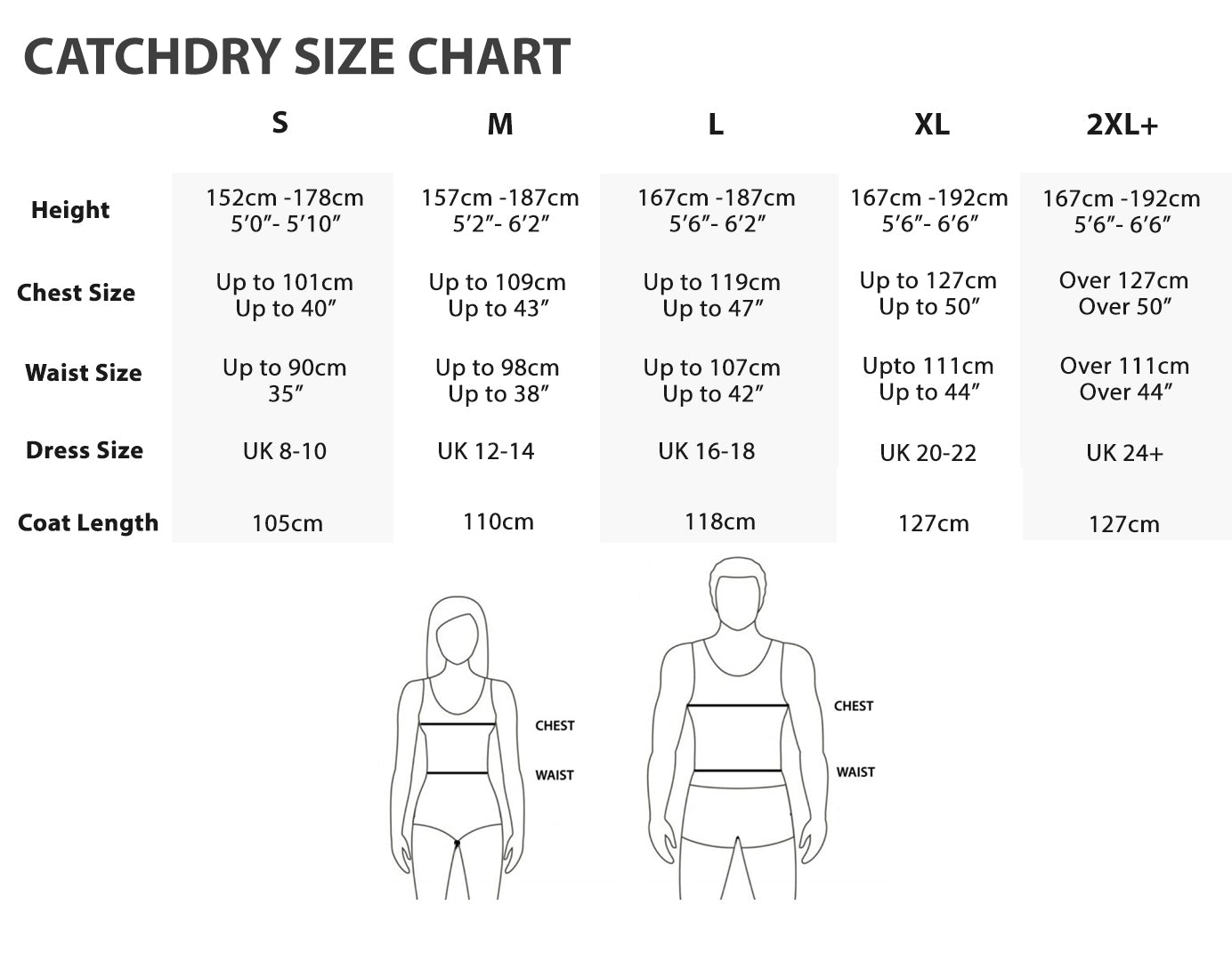 The Catchdry is designed to be oversized to offer you movement and flexibility while fishing. For example if you normally wear a XXL T-Shirt the XL Catchdry will be plenty big enough.